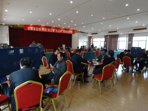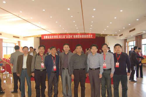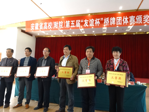 10月25日下午至27日上午,由省教育工会举办、安庆师范学院承办的“安徽省高校(附院)第五届‘友谊杯’桥牌团体赛”在安庆市隆重举行。省总工会常委、省教育工会主席夏建华、省教育工会王玮、李大伟以及安庆师范学院党委副书记殷红等出席了颁奖仪式。