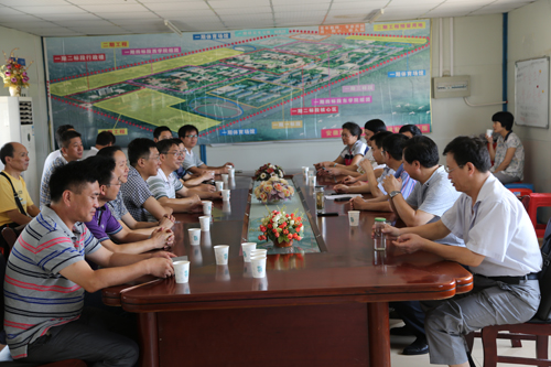 在工地项目部会议室,新校区指挥部副总指挥曹光保、洪江如代表指挥部全体工作人员对校、院两级工会组织冒着高温到工地慰问表示衷心感谢,并分别介绍了新校区建设的历程、五个标段工程的建设现状、新校区教职工住宅区建设进展状况等方面的情况。纪监小组王振斌处长就现场工程建设的监管等作了解释。审计小组郑为超处长就新校区建设中的有关联合审计工作作了说明。
