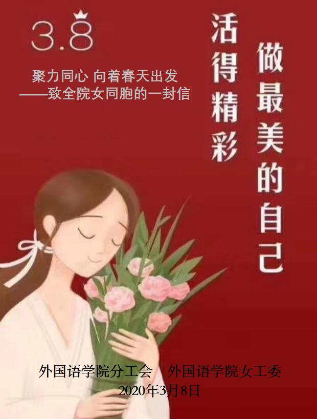 外国语学院以学院分工会、女工委的名义发布了题为《聚力同心 向着春天出发——致全院女同胞的一封信》的网络书信,向84名在职和离退休女教职工送去了节日的祝福,也向4位奋战在新冠肺炎疫情防控第一线的男职工家属表达了崇高的敬意,并在网络书信中号召女同胞们始终牢记“奋斗是三八精神最美的底色”,在抗击疫情这场没有硝烟的战争中,在家庭、单位、社区和网络教学平台里,继续发挥“妇女能顶半边天”的重要作用,全院广大女职工继续弘扬“疫”往无前的战斗精神,积极投身各项事业,绽放精彩人生;始终牢记“坚守是三八精神最美的绽放”,在疫情还没完全消除的当下,保持从不懈怠的坚守,主动融入保障经济社会发展的主战场、巾帼建功的文明岗,有序复工复产,争取把学生和孩子延长假期的学习进度“赶”上来,把排定的教学科研任务“紧”起来,把失去的时间“夺”回来;始终牢记“奉献是三八精神最美的诠释”,继续弘扬团结友爱的志愿服务精神,关心关爱困境特殊群体,发挥自身特长,为一线医护人员家庭子女奉献爱心,推动全社会形成学习英雄、礼遇英雄、见贤思齐的良好氛围;始终牢记“文明是三八精神最美的姿态”,在疫情未完全解除的情况下,继续带领家庭成员学习科学防疫知识,积极践行不扎堆、不集聚的“文明出行”方式,积极倡导勤洗手、勤消毒、多通风,多喝水、多锻炼的“文明生活“方式,自觉传承中华民族尊老爱幼的传统美德,守护好家人健康,照顾好老人和孩子,在家庭中争当好女儿、好妻子、好儿媳、好母亲,以良好的家风推动和谐社会建设。