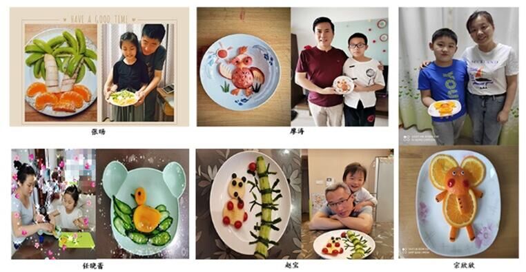 亲子创意水果拼盘活动以教职工家庭为单位居家自行开展,家长和孩子尽情发挥奇思妙想,巧妙地利用不同水果的自身形状、颜色等拼出了各种有趣创意造型,带来了一堂生动的亲子创意课。他们或切或拼,或挖或雕,忙得不亦乐乎。有的将苹果做成“愤怒的小鸟”,有的将芒果做成“小鸭子”,有的将黄瓜切得薄如蝉翼,有的将香橙细削开如含苞待放的花苞……此次活动共有近20位教职工家庭参加,各个家庭的作品都独具匠心,令人眼前一亮。经过评比,胡胜利等三个家庭荣获一等奖,赵宝等五个家庭荣获二等奖,刘文娟、林玉娥、刘向举、祁龙、许欢、张玉等七个家庭荣获三等奖。