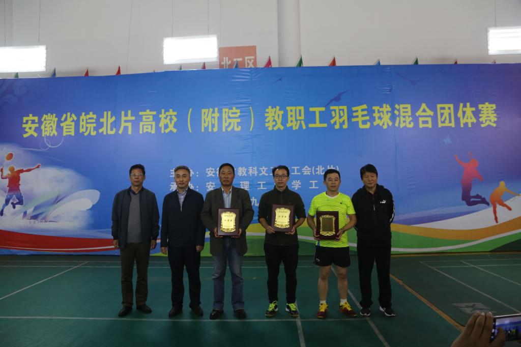 赛后举行了颁奖仪式。安徽省教科文卫体工会调研员经审委主任唐成、校教职工羽毛球协会负责人及我校工会负责人分别为获奖单位颁发了奖牌。