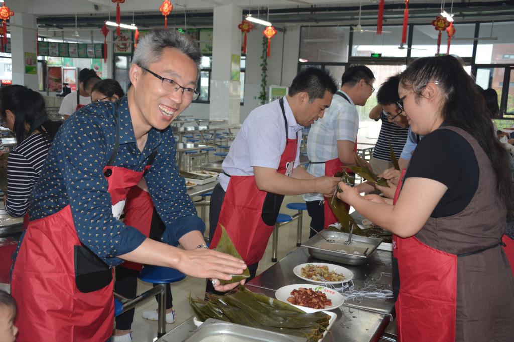 活动现场,粽叶飘香。一片片清香的粽叶、一粒粒晶莹的糯米,在大家的巧手下,经过折粽叶、装糯米、定型、扎绳等一系列步骤,瞬间变成一个个诱人的粽子,活动现场欢声笑语,其乐融融。师生们一边包着粽子,一边谈论着各自家乡的端午习俗,欢乐祥和的节日氛围充满了整个餐厅。