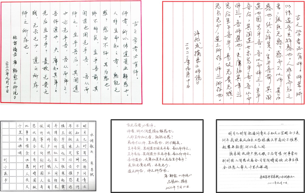本次比赛书写内容限定为韩愈《师说》片段、苏轼《水调歌头明月几时有》全文,创作字体不限。广大教职工积极参与,在与家人共度佳节之际,满怀激情进行创作。比赛共收到硬笔书法作品50余幅,评出一、二、三等奖若干。