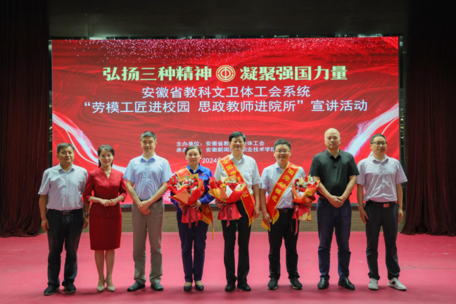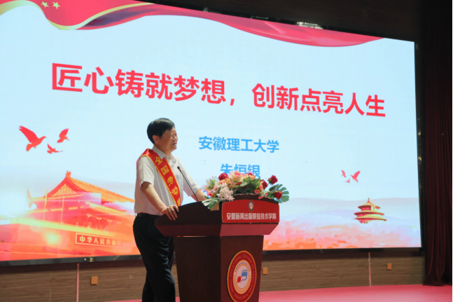 6月21日,由安徽省教科文卫体工会主办、安徽新闻出版职业技术学院承办的“劳模工匠进校园、思政教师进院所”宣讲活动,在安徽新闻出版职业技术学院图书科技楼报告厅举行,我校全国劳动模范、大国工匠朱恒银教授应邀参加本次活动并作主题宣讲报告。