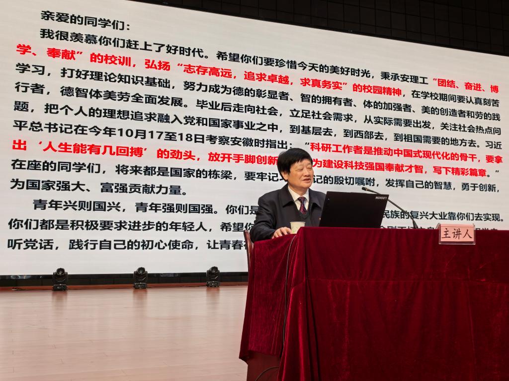 朱恒银从传承红色基因,扣好人生的第一粒扣子、坚守平凡岗位实现人生价值、不忘党恩,创新筑梦、老骥伏枥,初心不变等方面,分享了自己生活、学习和扎根地质钻探一线46年的工作经历、取得的成绩和拼搏奋斗的感悟,用朴实的语言、详实的案例阐释了爱岗敬业、精益求精、追求创新、团结协作、淡泊名利的新时代工匠精神。他殷切寄语学生,要始终保持持之以恒,不躺平、不自卑,不畏艰难,敢于奉献担当,胸怀志远,勇于创新,追求卓越的品质,要用实际行动践行学校“三有三进三到”办学理念,弘扬劳模、劳动、工匠“三种精神”,用创新书写自己精彩的人生。