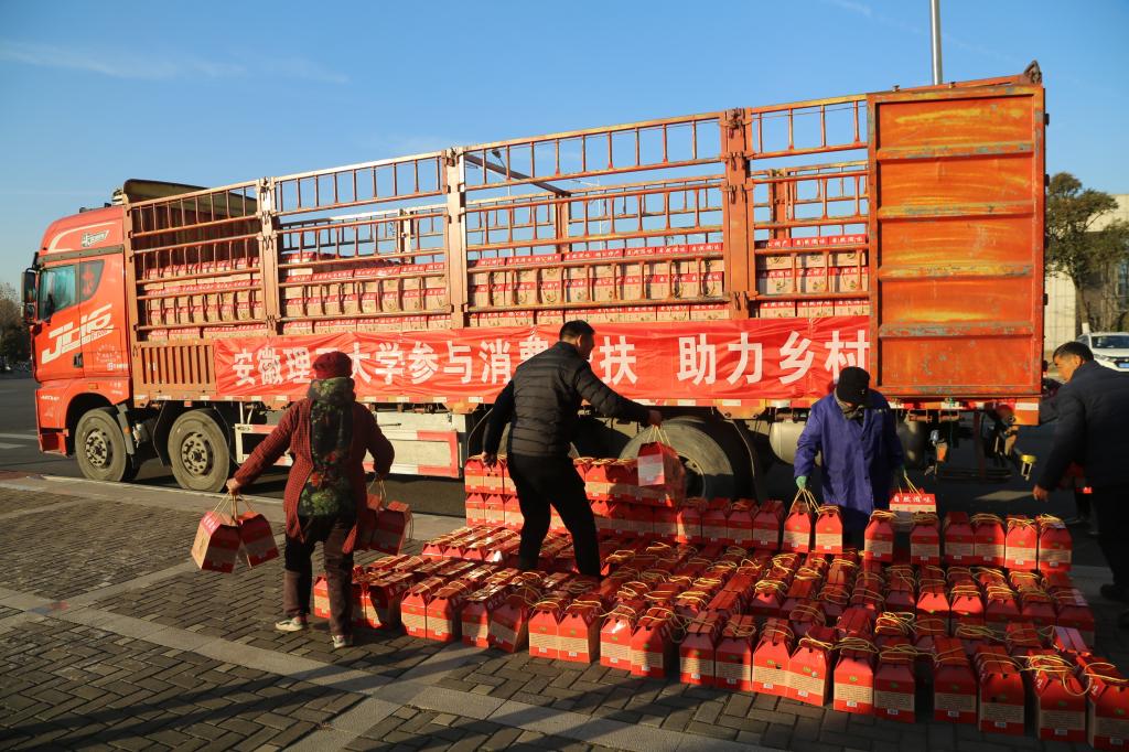 1月9日,在春节来临之际,学校将乡村振兴消费帮扶与教职工春节福利发放有机结合,将从定点帮扶的谢家集区汤王村和大通区三和镇新华村采购的大米、杂粮、香菇等41万余元的绿色农产品发放给教职工,向教职工致以春节的问候和祝福。
