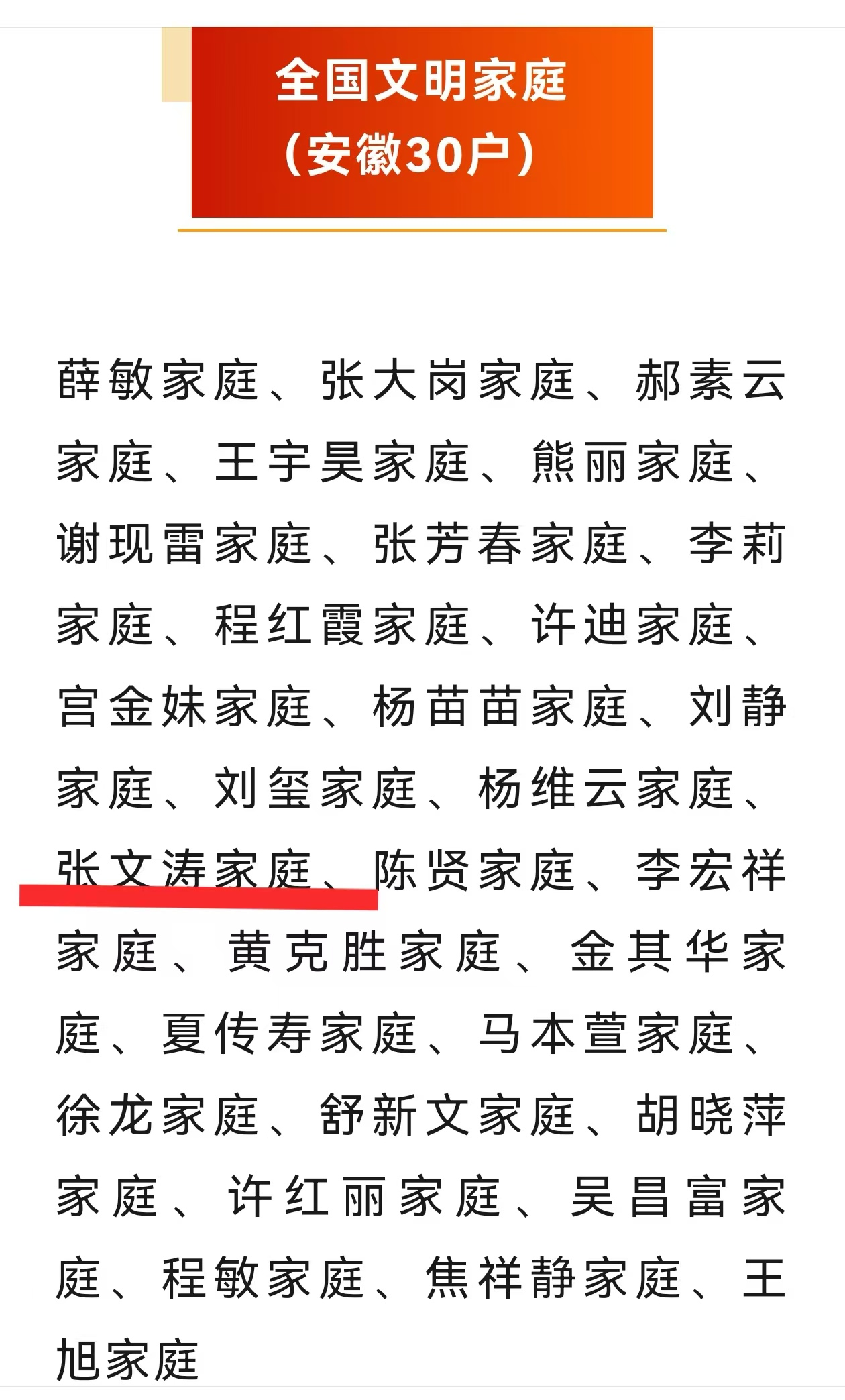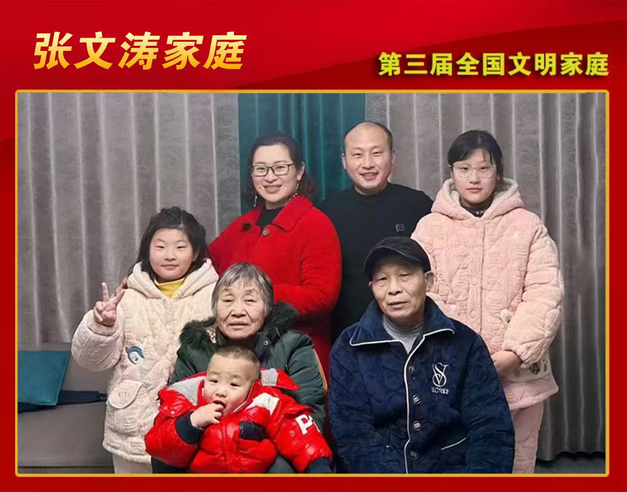 张文涛与妻子王珍在各自岗位发光发热,张文涛一家用爱与责任书写着文明家庭的动人篇章。2021年6月至2024年6月,张文涛主动投身乡村建设,作为第八批选派干部,率领工作队助力淮南市高新区新华村脱贫攻坚与乡村振兴,三年食宿于村,一心扑在工作上。王珍是淮南市第六中学教师,克服重重困难,精心备课,勇挑多年级课程教学重担,助力学子夺魁。面对年迈患病的父母,张文涛和王珍悉心尽孝,每周两次为因病致残卧床11年的父亲清洗身体、陪其康复训练,父亲10几年没生过一个褥疮,王珍常为腰痛的婆婆按摩缓解疼痛。他们一家还是邻里和睦的典范,客厅成为邻里聚会之所,夫妻俩乐于助人,扶老携幼、照看邻家稚子。女儿也化身“小帮手”,帮小伙伴复习功课。张文涛家庭以实际行动传承古训,夫妻俩爱岗敬业、真诚待人;孩子们勤学善思、积极向上。一家人和睦相处,在单位和邻里间传为佳话,践行时代新风,传递了向上向善的正能量,张文涛家庭先后被授予淮南市文明家庭、安徽省五好家庭、安徽省文明家庭称号。2025年,张文涛家庭获评第三届全国文明家庭称号。