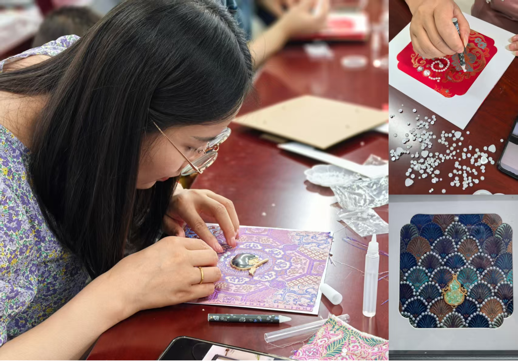 第一个活动是宋锦珍珠画制作体验活动,工会工作人员按组为参与者发放了材料包,还提供了多种端午主题设计图供大家选择。大家齐心协力,充分发挥创意,将宋锦的华美与珍珠的温润巧妙融合,精心制作出一幅幅独具特色的宋锦珍珠画,现场气氛热烈而温馨。