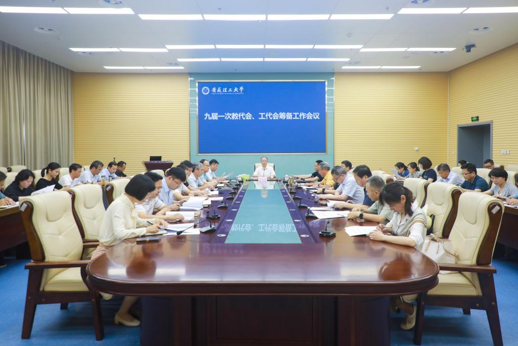 7月9日上午,校党委书记郭永存在全国重点实验室1号会议室主持召开安徽理工大学第九届工会会员代表大会第一次会议和第九届教职工代表大会第一次会议(以下简称“两代会”)筹备工作会议。校党委副书记、常务副校长余玉刚,校党委常委、副校长鲁超出席会议。