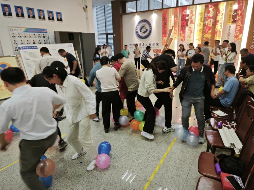 活动共设三项趣味游戏。“抢凳子”环节率先点燃气氛,教职工们随着音乐绕圈走动,音乐戛然而止时大家争相落座,场面紧张有趣,掌声与笑声交织。“踩气球”比赛中,队员们脚绑彩色气球,灵活躲闪、巧妙进攻,既有竞争又有协作,现场氛围热烈温馨。最后的“珠行千里”项目考验团队配合,队员们手持管槽接力传送小球,彼此提醒、默契配合,展现出良好的团队精神。