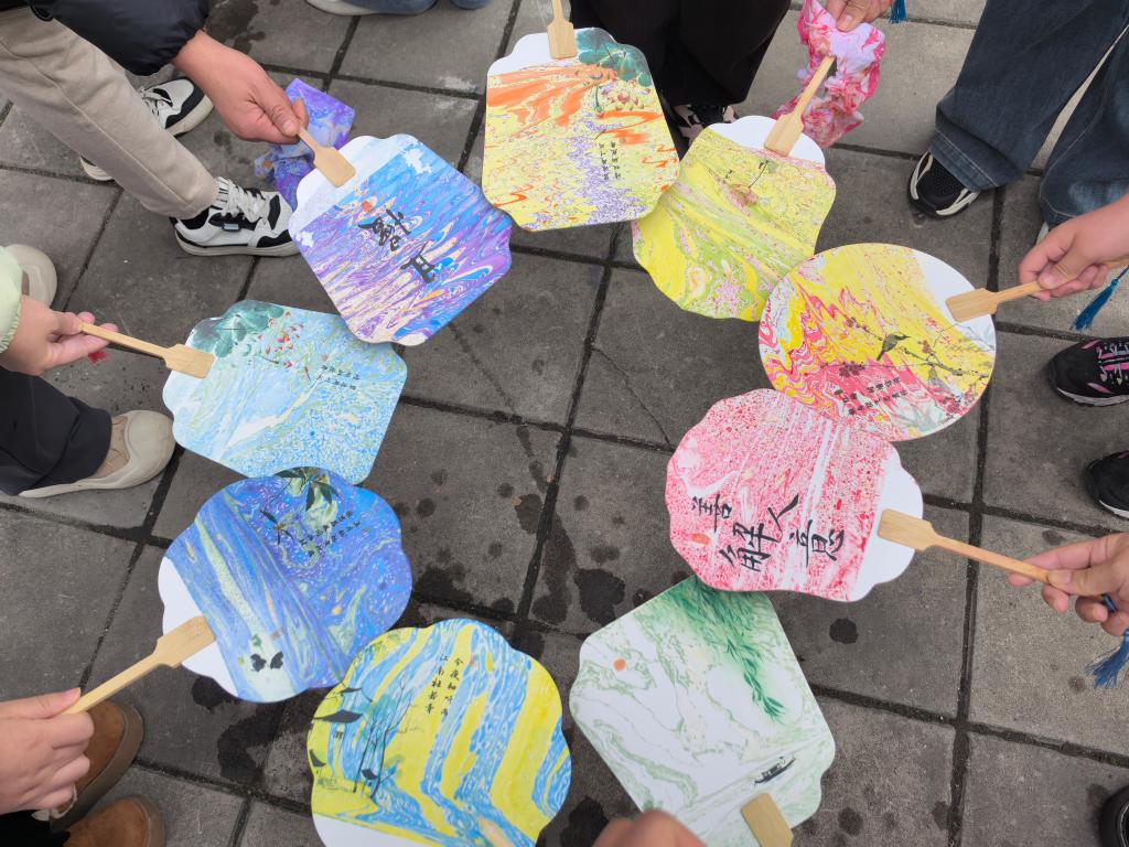 活动开始,在专业老师的指导和演示下,老师们手持扇子跃跃欲试,五颜六色的油漆滴入水中,以点、甩、弹、划等手法在水面形成图案,扇子缓缓以斜插、旋转、“Z”字等方式浸入水中,漆膜随着水的流动性附着在扇面上,捞出水面,一把独一无二的作品就完成了,女老师们你看看我的作品,我看看你的作品,相互交流制作的心得。活动现场欢声笑语,大家玩的不亦乐乎。
