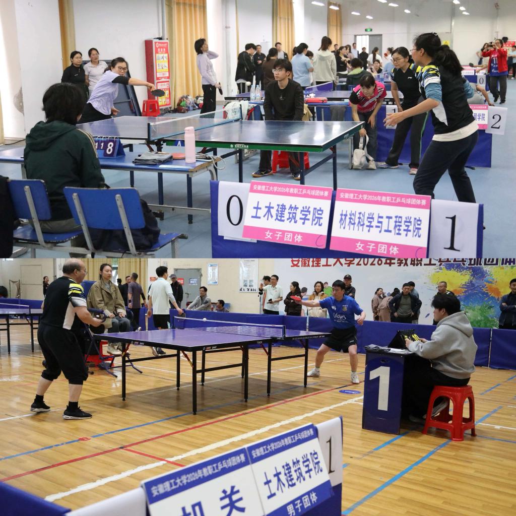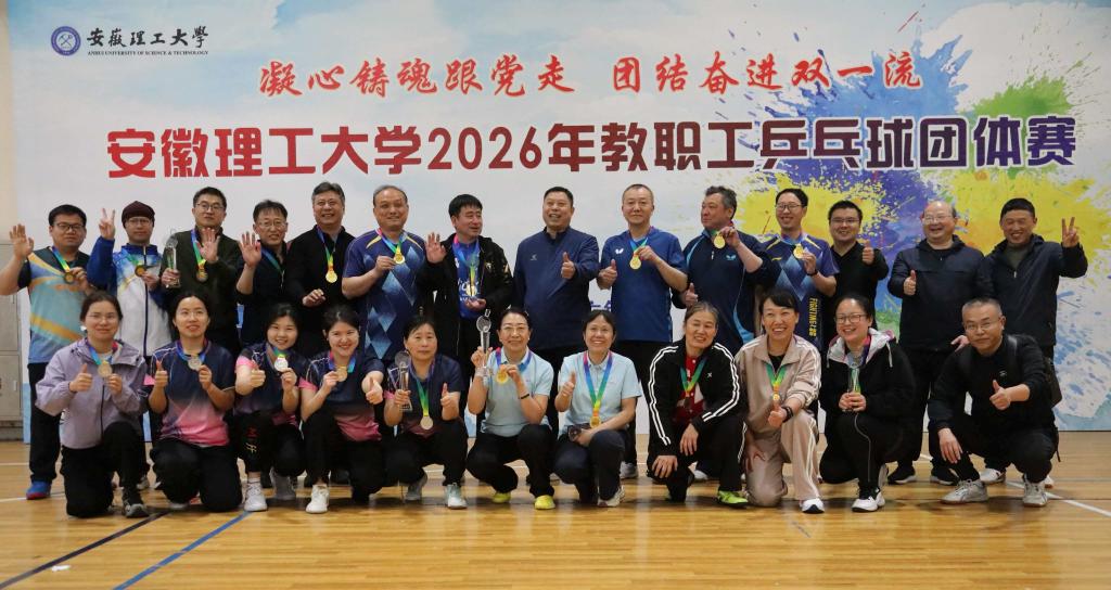 为丰富教职工文体生活,增强团队凝聚力,营造积极向上的校园文化氛围,学校2026年教职工乒乓球团体赛于4月11日—12日在自强体育馆火热开赛并圆满收官。来自全校各分工会的25支男队、18支女队齐聚赛场,以球会友、切磋球技,展现了安徽理工大学教职工昂扬奋进的精神风貌。校党委常委、副校长鲁超全程观看了比赛,并为获奖球队颁奖。