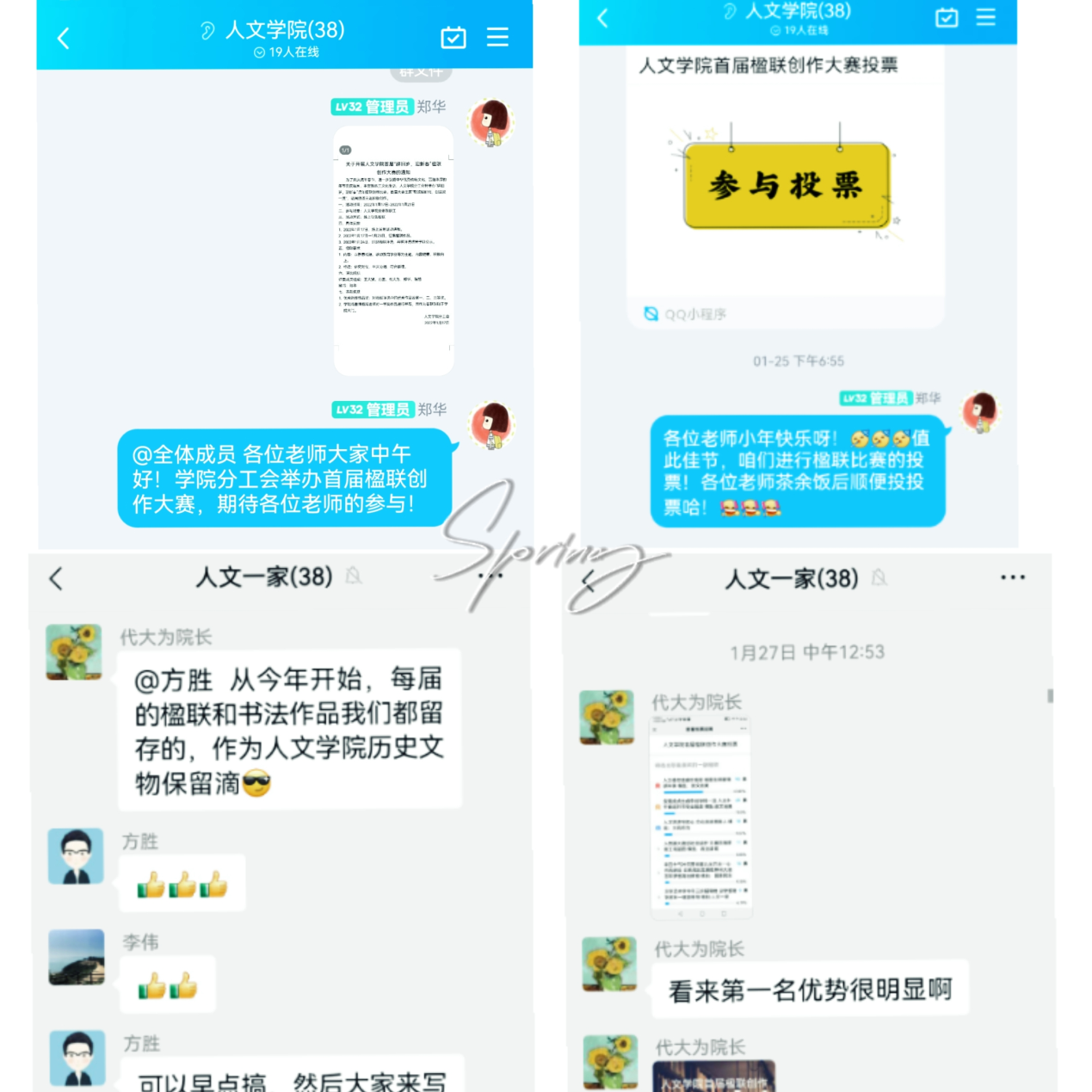 本次楹联创作大赛围绕“歌颂新时代,创建双一流”的主题,采取线上发布通知、征集作品、网络投票的形式举办,吸引了广大教职工的积极参与。活动过程中,老师们在线上交流畅谈、争相创作。
