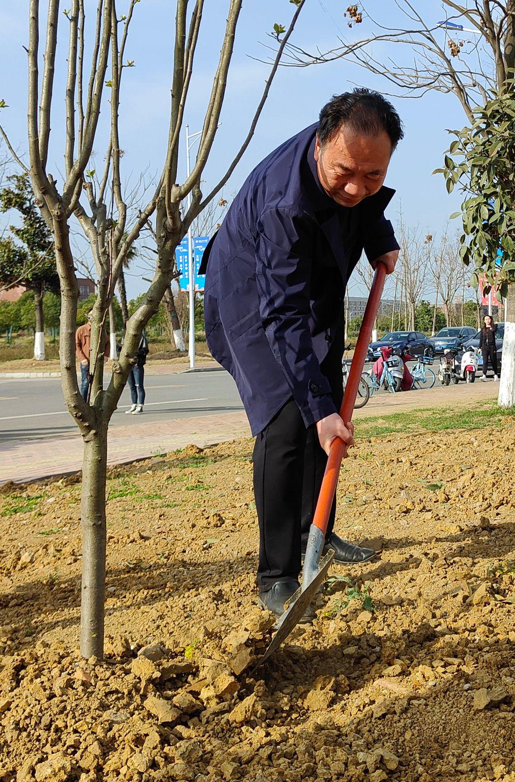 人文学院书记王大贤、院长方胜、副书记姚嗣宏与教职工、志愿者们一起相互配合、分工合作,铲土挖坑、扶植幼苗。大家齐心协力将一棵棵海棠树幼苗移植到土坑中,再培实新土、提水浇灌。在大家的默契配合下,植树活动有序开展。