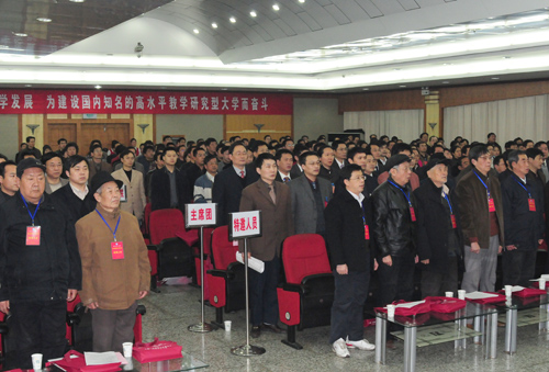 开幕式上,校长颜事龙作了题为《勇于创新 科学发展 为建设国内知名的高水平教学研究型大学而奋斗》的学校工作报告。报告从人才培养、教学质量、学科建设、科研工作、对外交流与合作、师资队伍建设、办学空间与条件、管理体制机制、思想政治教育、毕业生就业、校务公开、“十一五”发展规划实施等十二个方面,对学校过去五年的工作进行了全面回顾。颜事龙强调,今后一个时期学校要着力抓好九个方面的工作:以“质量工程”项目建设为载体,进一步提高教育教学质量;以加强重点学科建设为切入点,不断增强学科实力和竞争力;创新科技管理体制,提高科研管理水平和社会服务能力;以高水平师资队伍建设为重点,进一步推进人才强校战略;提高对外交流与合作层次,进一步扩大学校的影响力;完善校园公共服务体系,进一步改善办学条件;加强制度建设,实施科学管理,进一步激发办学活力;加强学生教育与管理,提高学生综合素质;加强校园文化建设,关注师生切身利益,构建和谐校园。