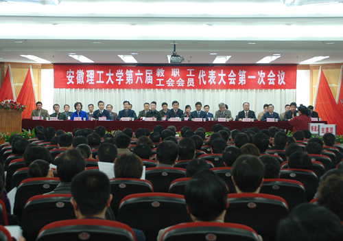 3月27日下午,校六届一次教代会、工代会在教学楼九楼报告厅隆重开幕。省教育工会副主席王兰,校领导张明旭、颜事龙、昝连生、乔丰强、叶醒狮、王洪和大会执行主席在主席台就座。两代会代表和特邀人员300多人参加了开幕式。开幕式由校党委副书记王洪主持。安徽省高校工会教代会工作研究会、中国科学技术大学和中国矿业大学等40多家单位向大会发来了贺信和贺电。