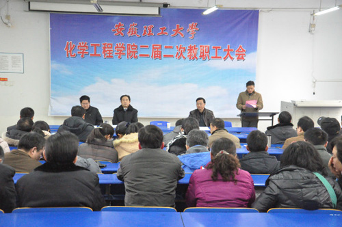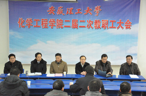 2012年12月28日,化学工程学院全体教职工齐聚一堂,隆重召开二届二次教职工大会。会议总结过去一年学院建设成就,客观分析面临的困难与挑战,共商新一年发展大计。副校长郭永存出席会议并讲话。校工会副主席夏邦权应邀和化工学院有关领导出席会议。